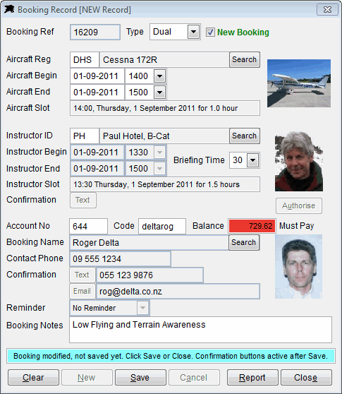 Briefing Time - You may set an optional briefing time of 30,60 or 90 minutes to be added to any dual flight booked. This function allows you to book the instructor with the normal dual flight but the result leaves the aircraft available for use during the pre-brief time. i.e. Instructor in the following example is booked for 2 hours but the aircraft is only booked for 1.5 hours. Choose '00' minutes to exclude or remove a pre-flight Brief from a flight.