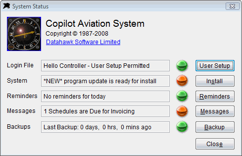 After a normal login with a valid user name and password the Copilot system will display the System Status form...
